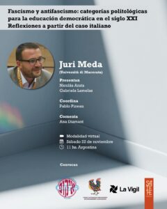 El CeDoB Pinie Katz – ICUF coorganiza junto a la Sociedad Argentina de Investigación y Enseñanza en Historia de la Educación – SAIEHE – el Grupo de Trabajo Permanente CIHELA: Autoritarismos y Educación en Iberoamérica y la Biblioteca Vigil de Rosario. Sitio de Memoria del Terrorismo de Estado el conversatorio Fascismo y antifascismo: actualidad de dos categorías politológicas para la educación democrática en el siglo XXI. Reflexiones a partir del caso italiano con la participación de Juri Meda – Università di Macerata.