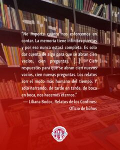 “No importa cuánto nos esforcemos en contar. La memoria tiene infinitas puertas y por eso nunca estará completa. Es solo dar cuenta de algo para que se abran cien vacíos, cien preguntas. […] Cien respuestas para que se abran cien nuevos vacíos, cien nuevas preguntas. Los relatos son el modo más humano del tiempo. Y solo narrando, de tarde en tarde, de boca en boca, nos hacemos eternos.”